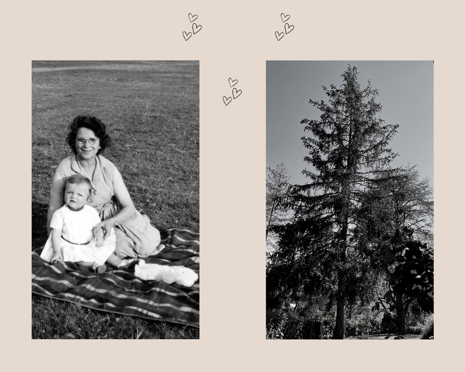 Un jour, après une longue promenade dans la forêt, à ramasser des pommes de pin, à écouter les oiseaux et à suivre les traces de bêtes sauvages inoffensives, Marguerite et sa petite-fille eurent l'idée de planter une pousse de conifère dans le jardin de la Grand-Mère.